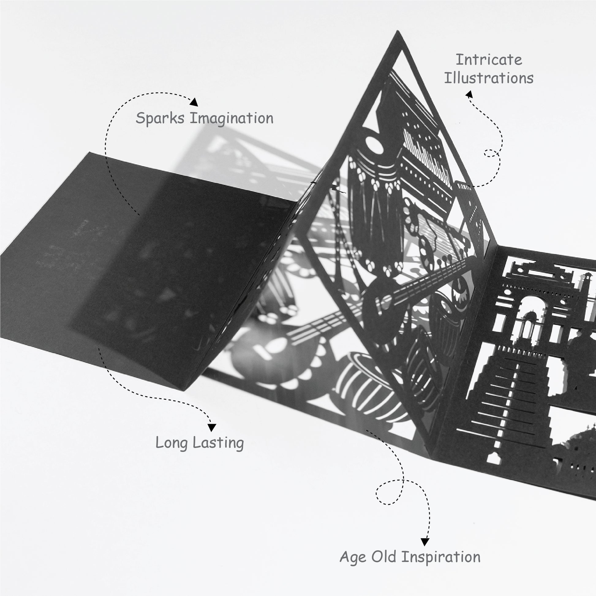 Shadow Art is inspired from the ancient art of shadow puppetry which was used as medium for storytelling and entertainment across many parts of India. The exact origination of this art form is unknown, but it was first seen in India around the 2nd century under the patronage of the Satavahana Dynasty and was called Tholu Bommalaata. Just how these shows helped immerse its viewers into a world of fantasy and imagination, we hope our version of shadow art does the same for you. Indian Culture covers dance forms, language, monuments and instruments. All these make up India's rich cultural legacy. The book comes with a story explaining the book but we encourage children to use their own imagination too.