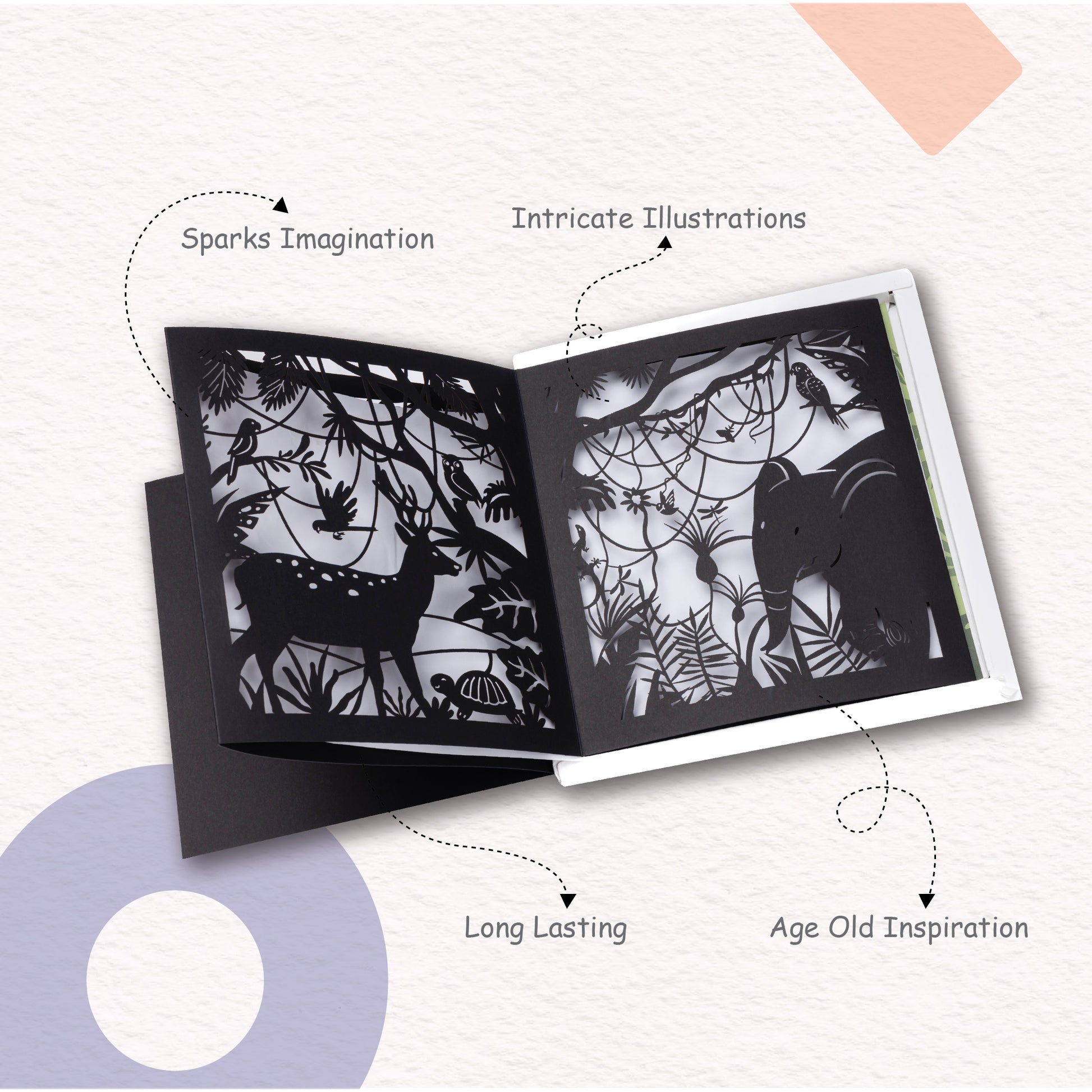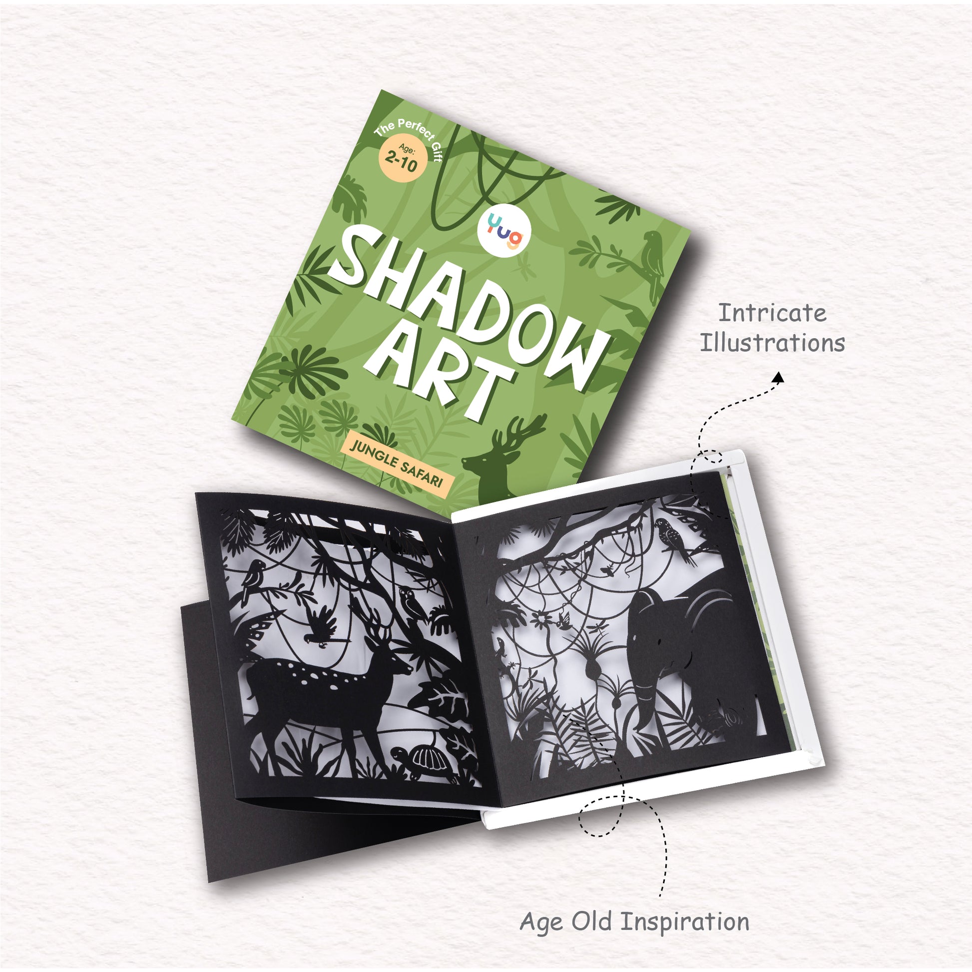 Shadow Art is inspired from the ancient art of shadow puppetry which was used as medium for storytelling and entertainment across many parts of India. The exact origination of this art form is unknown, but it was first seen in India around the 2nd century under the patronage of the Satavahana Dynasty and was called Tholu Bommalaata. Just how these shows helped immerse its viewers into a world of fantasy and imagination, we hope our version of shadow art does the same for you. This book, Jungle Safari is inspired by the jungles of Kaziranga in Assam. It takes you through a journey across the magnificent jungle. This comes along with a story but we want to encourage children to use their own imagination.