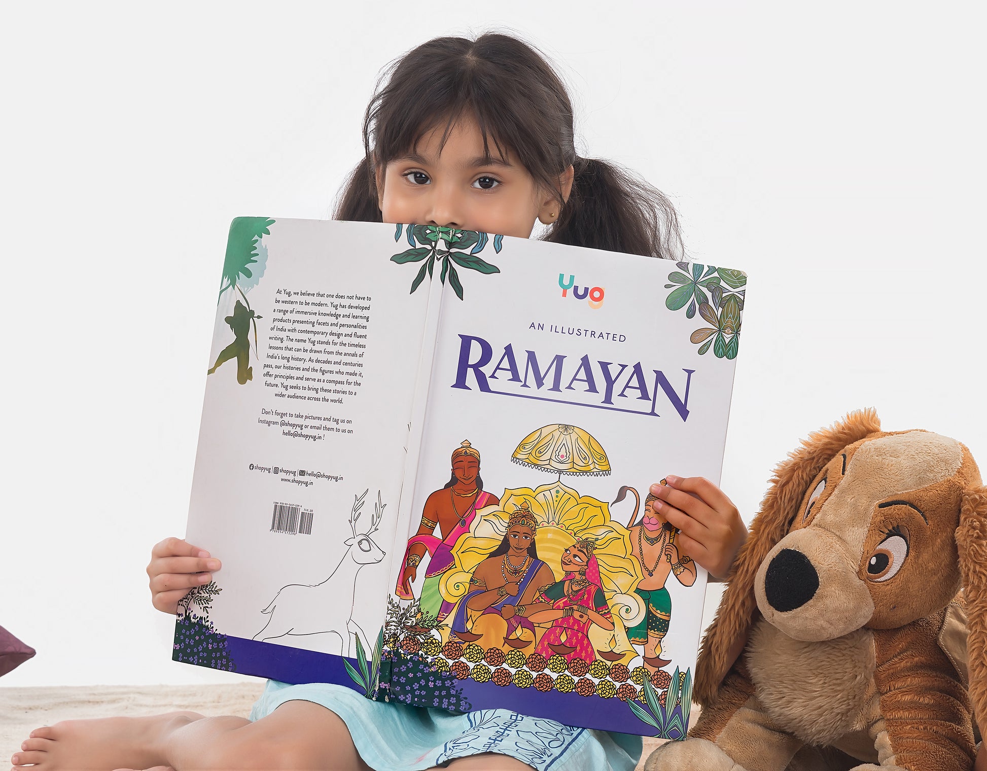 An Illustrated Ramayan which covers the Valmiki Ramayan in 56 pages and 21 chapters. Each has an emotion, shlok and learning.